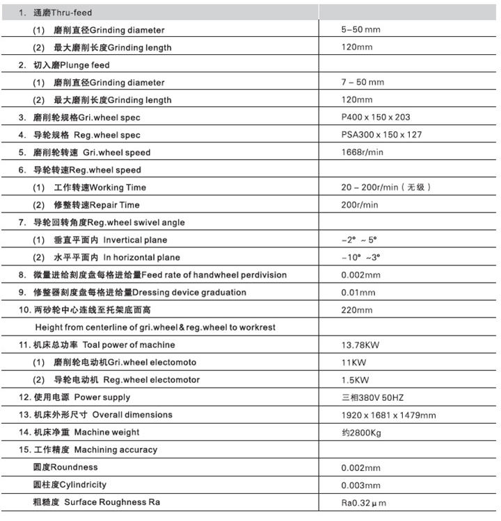 本机床可用于对各种圆柱体零件,环形零件及长棒料进行无心通磨加工,对圆维度小于1:20的圆锥体和各种成型回转体零件的元心切入磨削加工,适用于成批和大量生产需要。
